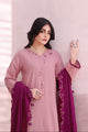- The look is completed with a contrasting deep magenta-toned shawl, detailed with cutwork embroidery and finely scalloped edges.